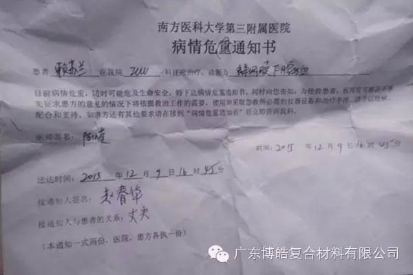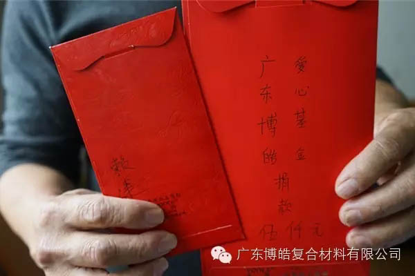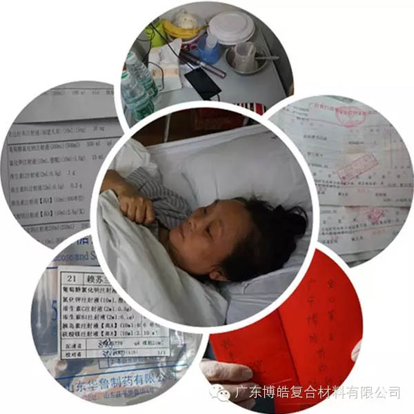 廣東博皓復(fù)合材料有限公司董事長經(jīng)熟人轉(zhuǎn)述得知此事,不僅積極號召身邊人,發(fā)動小型的微信捐資活動,還從博皓愛心基金支出5000元人民幣,為這位生病的母親加油。當(dāng)公司代表賴建明將5000元現(xiàn)金交到賴蘇蘭丈夫手中的時候,他稍稍有點哽咽。從當(dāng)時這位憨厚的丈夫百味交集的表情中可以看出,作為家里的頂梁柱,不管平日多么堅強,當(dāng)面對自己的親人被病魔纏身之時,又是多么的無助??粗@位被病痛折磨之下的45歲的媽媽,你很難相信她就是那個沒日沒夜加班只為讓家人可以稍微寬裕的母親,此刻,她無力的蜷縮在被窩里,嘴唇蒼白,臉色鐵青,雙眼無力的看著一滴滴藥水順著被針扎的凸起的血管流入身體,那就是她的希望,或許她和其他母親一樣,正在思考,大女兒是否穿暖,小女兒有無吃飽……..